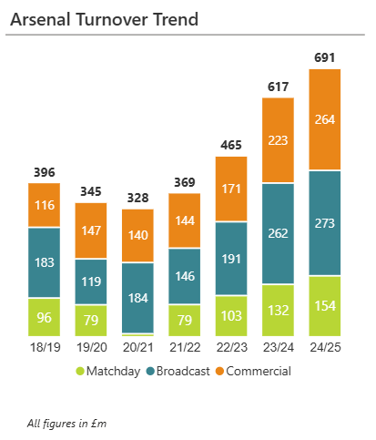 Revenue: Total revenue reached a record £691 million, up £74 million year-on-year, with growth across all major revenue streams. Progressing to the Champions League semi-final was a key driver, boosting UEFA distributions, matchday income, and commercial revenue. Arsenal's revenue is the third highest in the league.