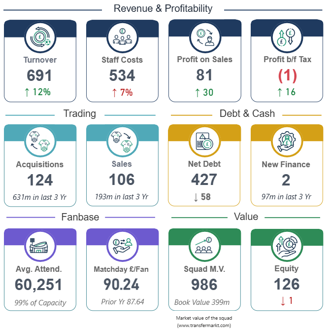 Profit/loss: The club reported a near break-even result, with a £1 million loss, compared with an £18 million loss in the previous season. The improvement was primarily driven by higher revenues and increased profits from player sales.