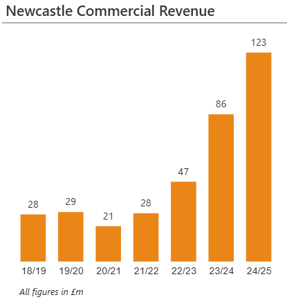 Commercial revenue is where the impact of the takeover is most evident. In the year of the takeover, the club generated £28 million in commercial revenue, which has now grown more than fourfold to reach £123 million in 2024/25.