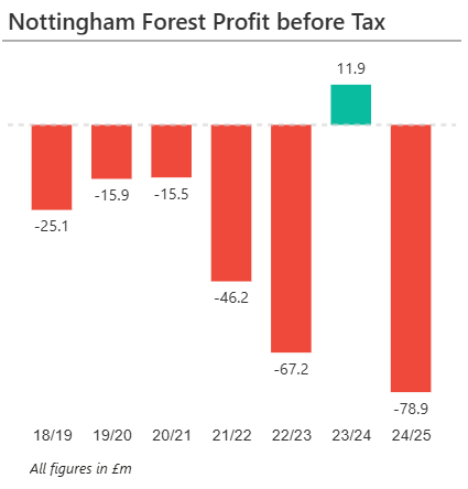 Following the PSR breach, Forest moved to reduce losses and, through several strategic player sales, recorded a profit in 2023/24. However, in 2024/25, a lack of significant player trading meant that, despite increased revenues driven by their higher league finish, the club returned to a loss of approximately £78 million.