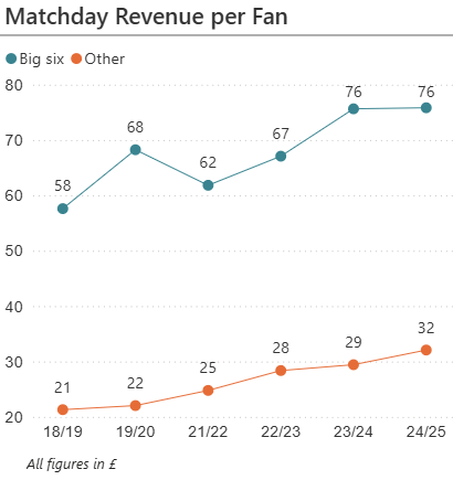 Average revenue per fan increased to £53.26 in 2024/25, up from £50.92 the previous year—an increase of 4.5%. Most clubs implemented price rises, with Nottingham Forest recording the largest increase at around 24%. The “Big Six” continue to command a significant premium in revenue per fan, averaging £75.83, while the remaining clubs generate less than half of this at £32.07.