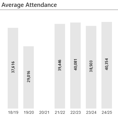 Average attendance rose from 38,503 to 40,354. This increase was primarily driven by capacity expansions at Liverpool and Fulham, as well as the fact that the newly promoted clubs recorded higher average attendances than those relegated.