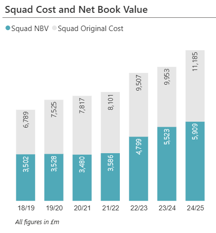 Net book value reached £5.9 billion in 2024/25, which is 64% higher than three seasons ago (before Chelsea’s major spending cycle began). The amortisation charge is also 42% higher than three years ago and will rise again this season.