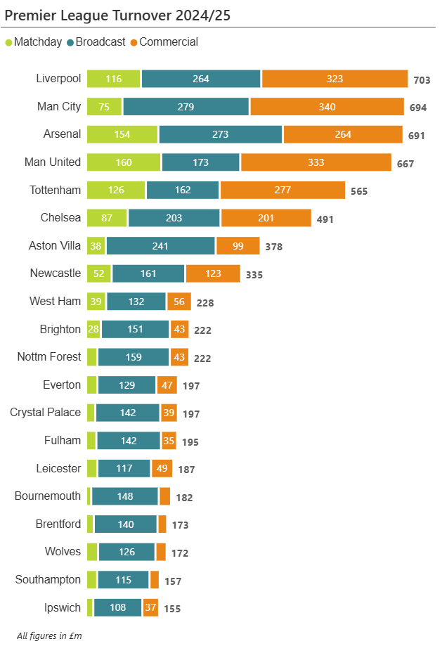 The chart below shows combined broadcast revenue for 2024/25, including Premier League distributions, UEFA payments, and FIFA Club World Cup income.