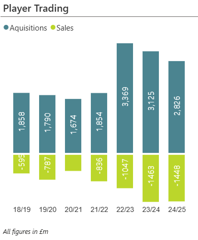 In 2024/25, player acquisitions fell to £2.8 billion, down from £3.1 billion the previous year. Player sales remained broadly stable at £1.44 billion, meaning net trading (acquisitions less sales) declined to £1.38 billion. This is closer to historical norms and well below the record net spend of £2.3 billion in 2022/23, of which Chelsea accounted for approximately £500 million.