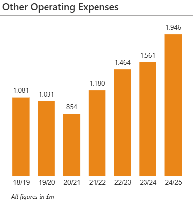Operating expenses represent a club’s day-to-day running expenses, including energy, technology, marketing, administration, and other overheads. These figures exclude staff costs and non-cash items such as depreciation and amortisation, as well as exceptional items like profits on player sales. In 2024/25, operating costs reached £1.946 billion—a significant 24.7% increase year-on-year—and accounted for approximately 28% of total revenue, up from 21% just two years earlier.